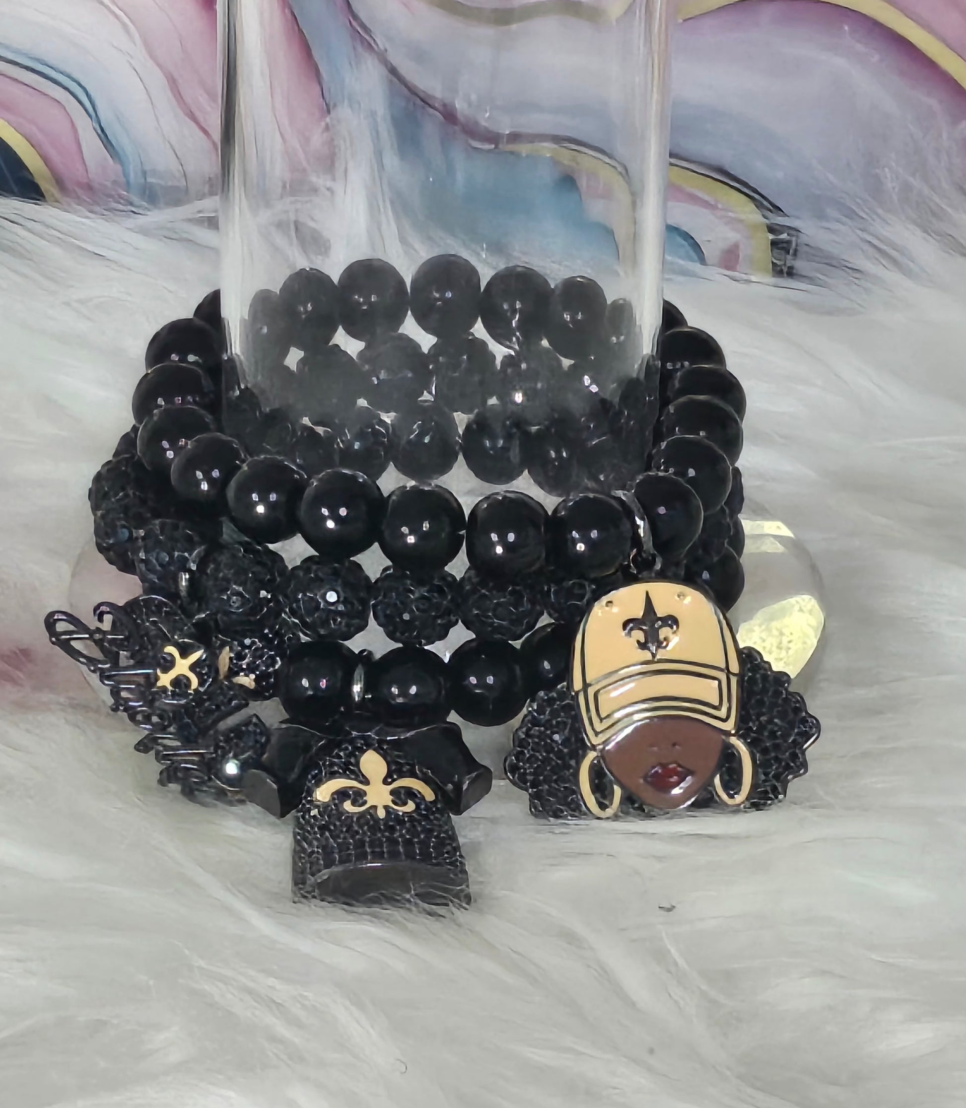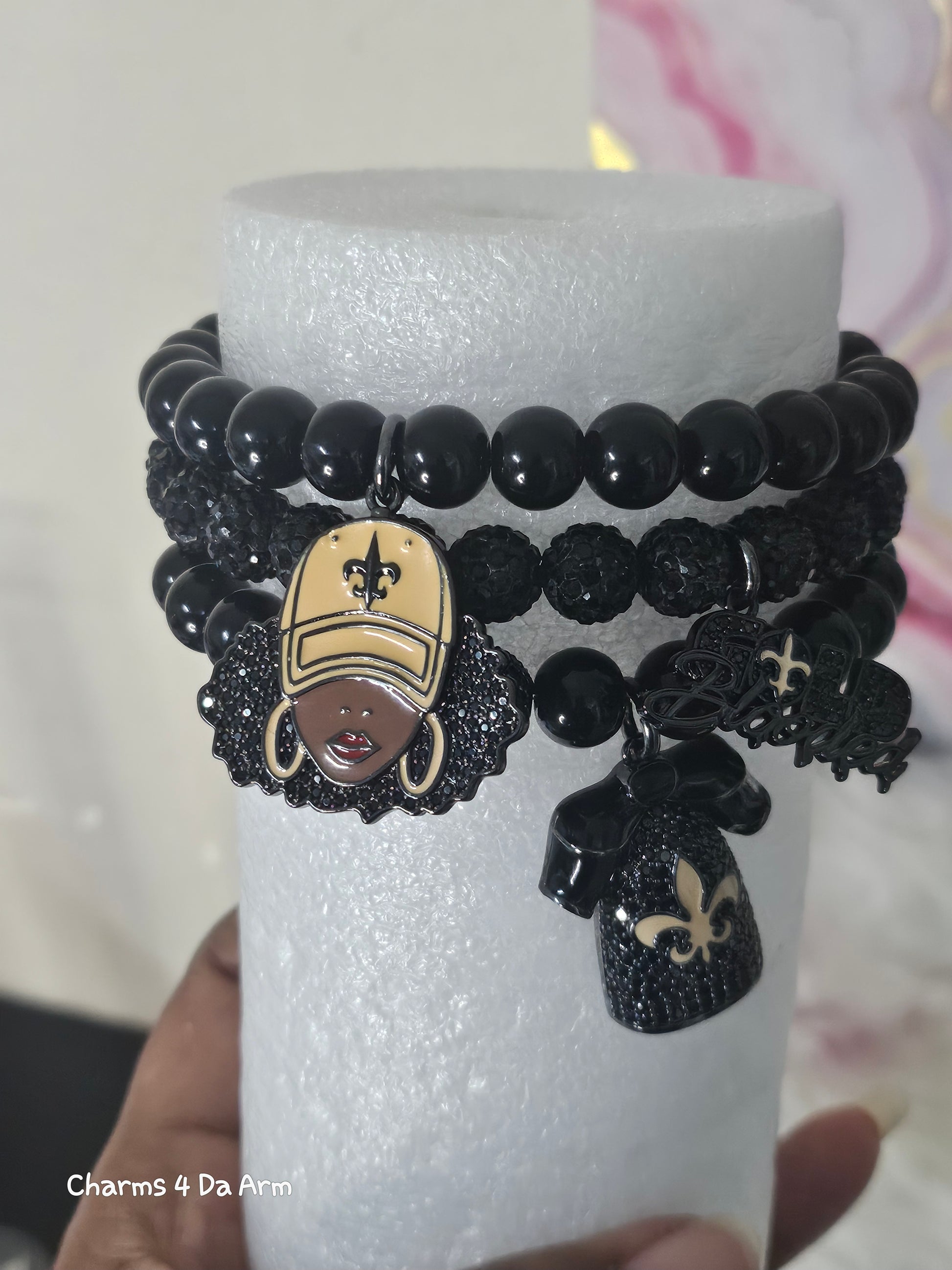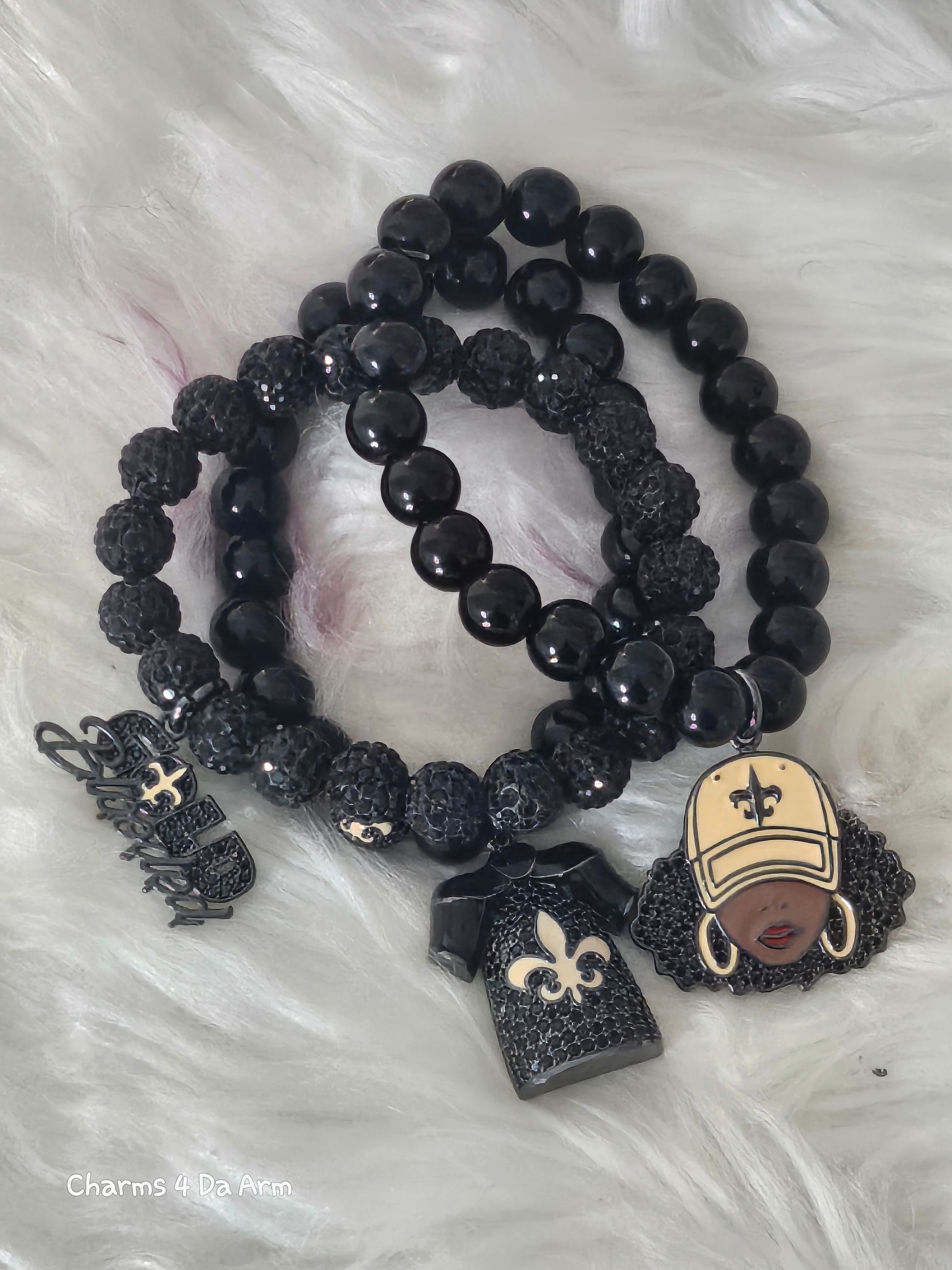 3 piece bracelet set with 3 charms and 1 Fleur Dis Lis bead. Fits 7 1/2 wrist with moderate stretch.